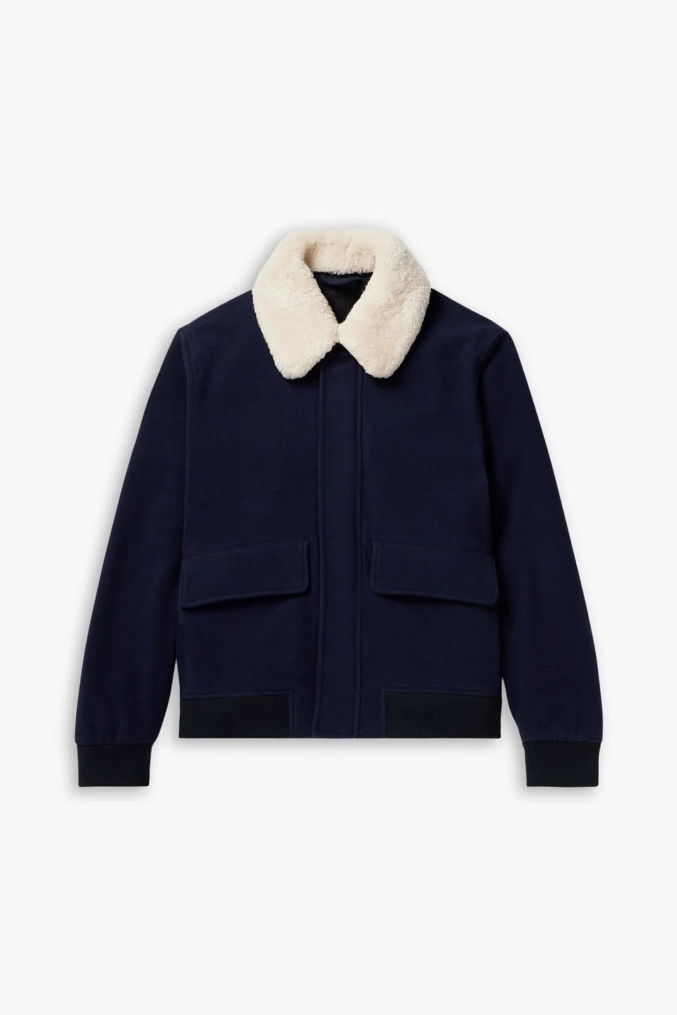 Bomber jacket wool-blend felt shearling trim knitted trims detachable collar front flap pockets concealed snap and zip fastenings through front fully lined mid-weight, non-stretchy fabric dry clean imported 75% Wool 20% Polyamide 5% Cashmere 0% Lambskin Product Code 46376663163064515