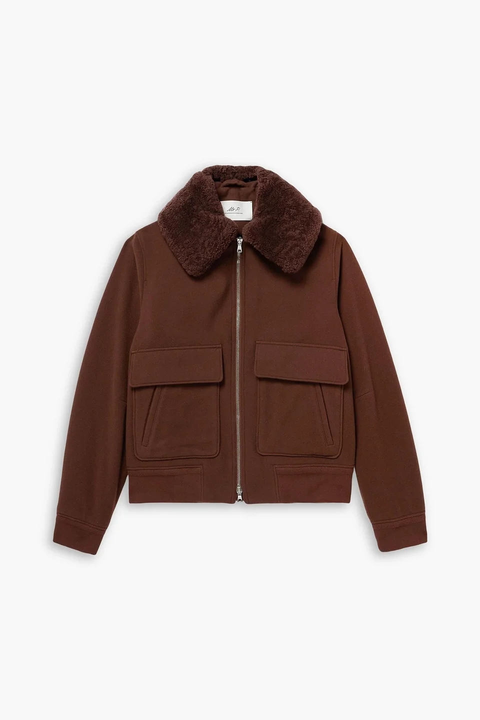 Bomber jacket wool-blend felt shearling trim knitted trims detachable collar front flap pockets two-way zip fastening through front fully lined mid-weight, non-stretchy fabric dry clean imported 75% Wool 20% Polyamide 5% Cashmere 0% Lambskin Product Code 46376663163064506