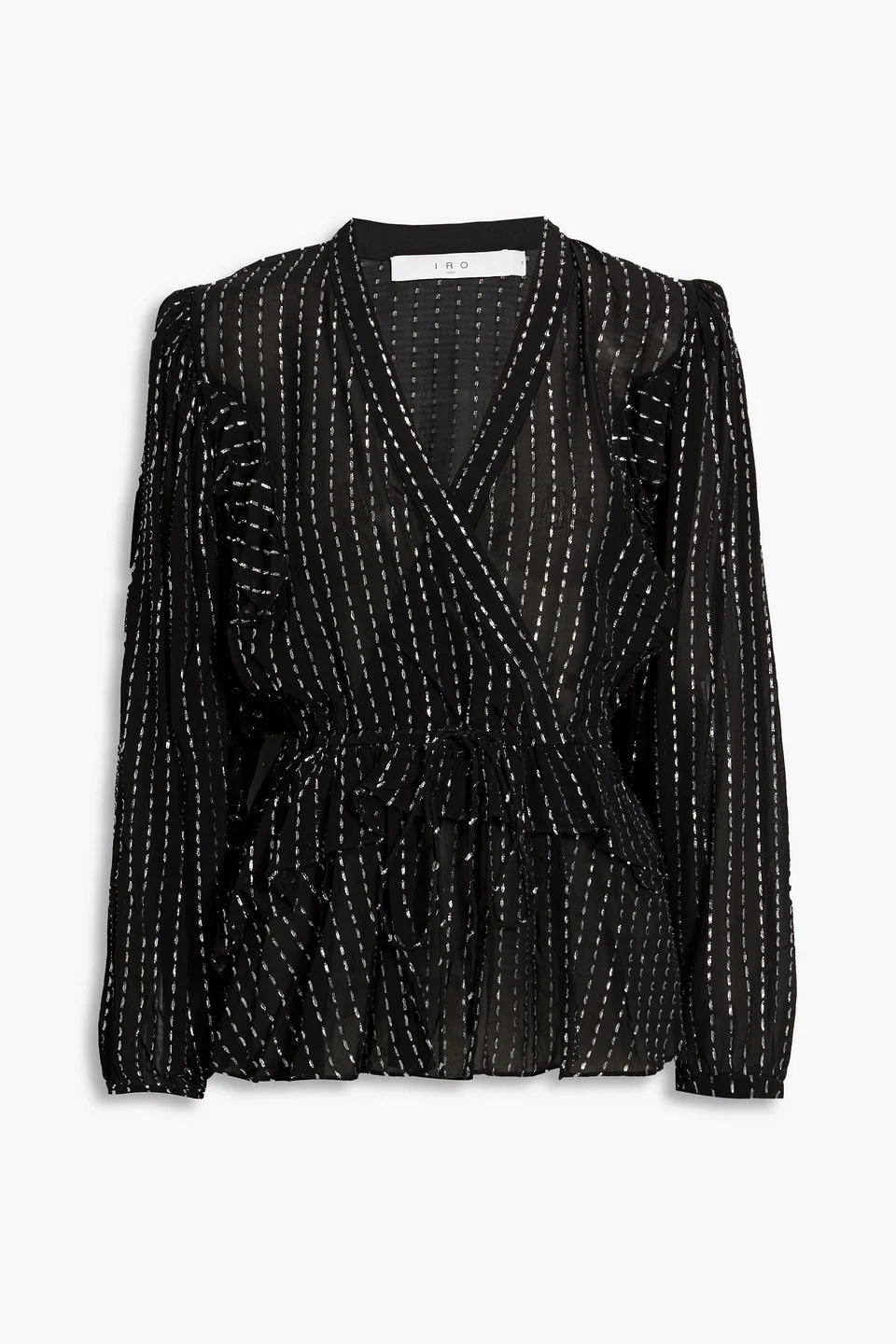 Blouse chiffon metallic fil coupe peplum wrap-effect drawstring waist slips on non-stretchy fabric lightweight fabric dry clean imported 95% Viscose 5% Polyester Product Code 1647597307210129