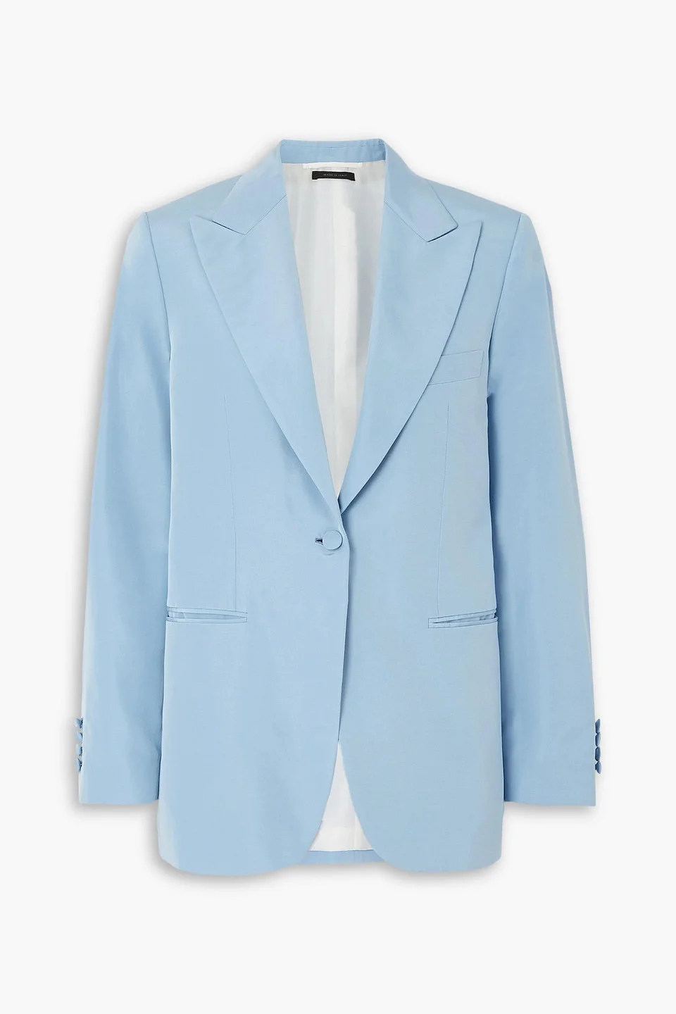 Blazer twill silk and cotton-blend shoulder pads non-functioning buttoned cuffs two front slit pockets breast pocket button fastening at front fully lined two back splits mid-weight, non-stretchy fabric dry clean made in italy Brioni's tailoring is always executed with faultless precision. This light-blue blazer is made from silk and cotton-blend twill with a subtle luster and has wide peak lapels and double back vents. The internal shoulder pads add structure, while the lining ensures easy layering. 55% Silk 45% Cotton Product Code 1647597347214489