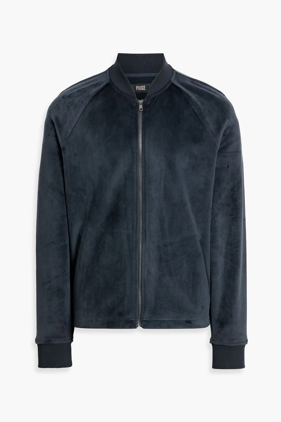 Bomber jacket velour knitted trims front slant pockets zip fastening through front mid-weight, slightly stretchy fabric machine wash or dry clean imported 65% Polyester 33% Cotton 2% Spandex Product Code 46376663163001673