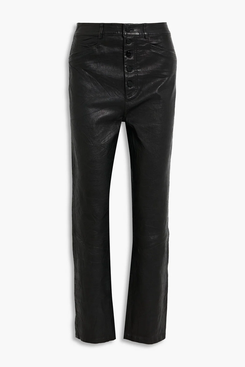 Straight-leg pants leather two front slant pockets two back patch pockets belt loops high-rise cut partially concealed button fastenings along front firm, non-stretchy leather specialist clean imported 100% Leather Product Code 1647597357475827