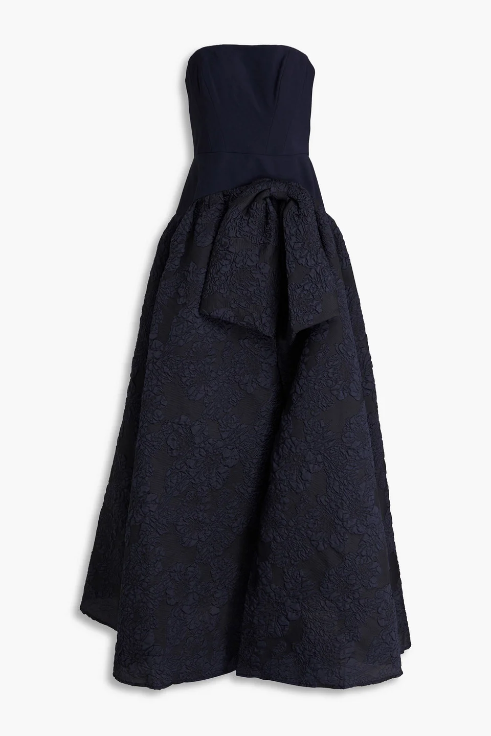 Brandish this breathtaking design on the red carpet or as you enter the gala gown crepe cloque paneled bow-detailed gathered front split concealed hook and zip fastening at back internal boning mid-weight, non-stretchy fabric dry clean imported 87% Polyester 13% Spandex Product Code 1647597351791931