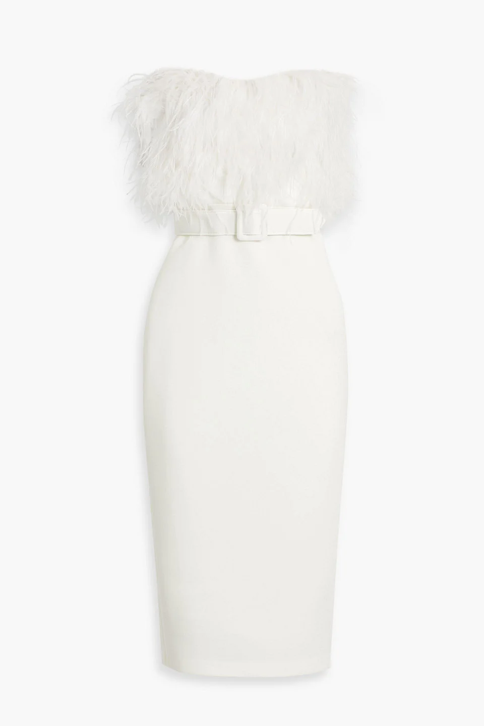 Strapless dress scuba feathers detachable belt back slit concealed hook and zip fastening at back fully lined mid-weight, slightly stretchy fabric spot clean imported Get ready to turn heads in Badgley Mischka’s stunning midi dress. Made from a mid-weight scuba fabric with feather embellishments, it’s perfect for making a statement at any event. Wear it with strappy heels and a clutch for a fabulous night out. 92% Polyester 8% Spandex Product Code 1647597308304430