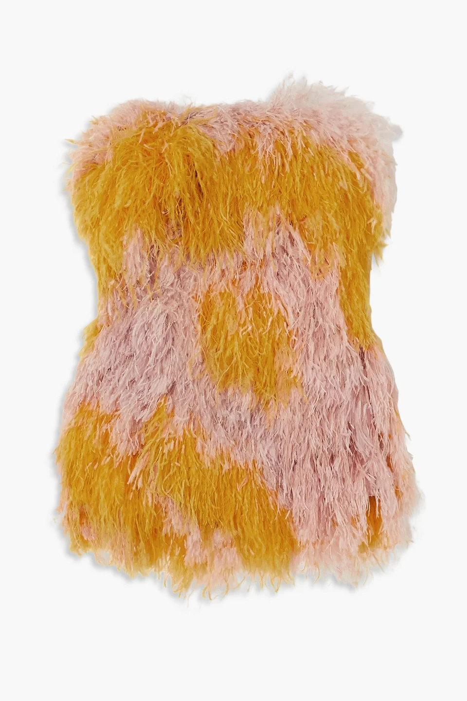 Strapless dress two-tone silk-satin ostrich feather concealed hook and zip fastening at back fully lined internal boning mid-weight, heavily embellished fabric specialist clean made in italy Thiss strapless mini dress has been made in Italy from lustrous silk-satin and embellished with fluffy plumes of pink and yellow feathers. Style yours with neutral accessories. 100% Ostrich feathers Product Code 1647597347345868