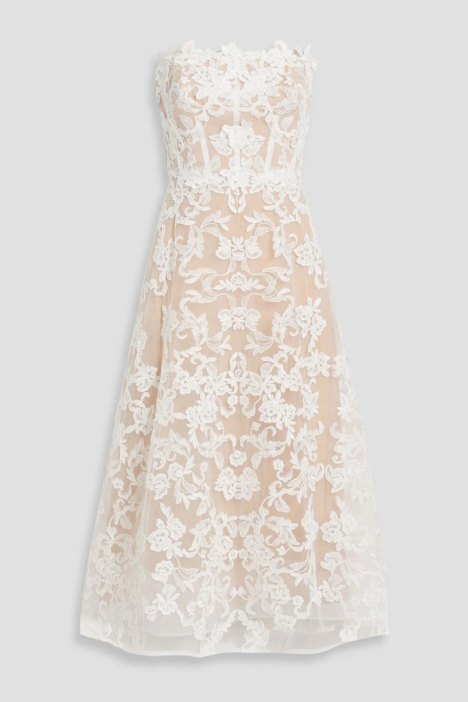 Strapless floral-appliquéd corded lace midi dress