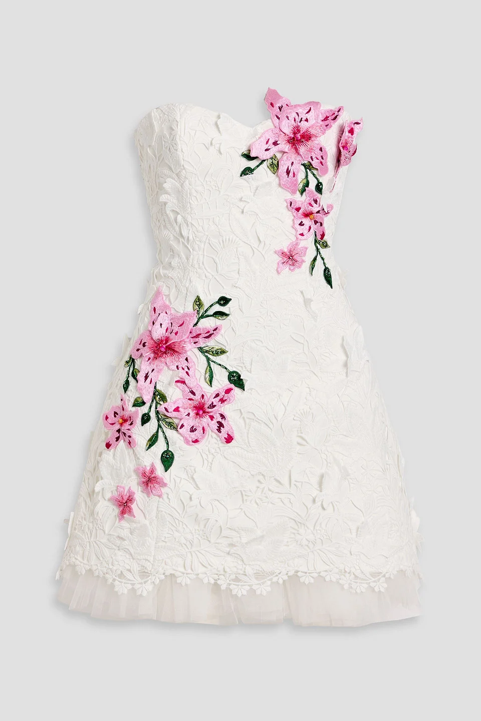 Strapless floral-appliquéd guipure lace mini dress