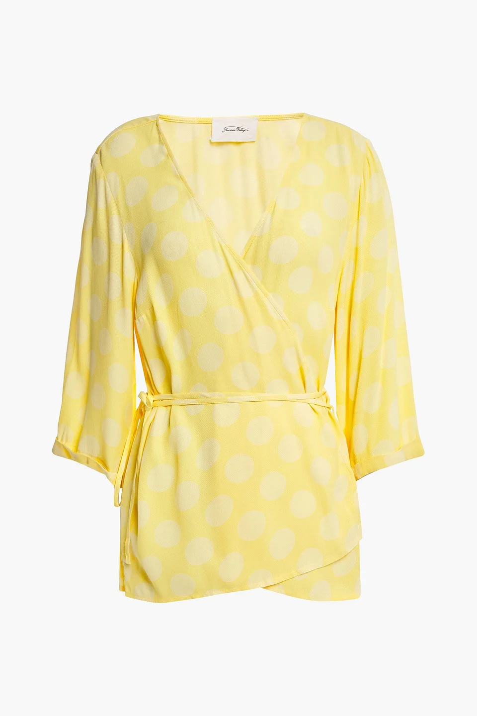 Wrap top polka-dot twill folded cuffs ties at waist non-stretchy fabric mid-weight fabric hand wash or dry clean imported 100% Viscose Product Code 29012654081270881