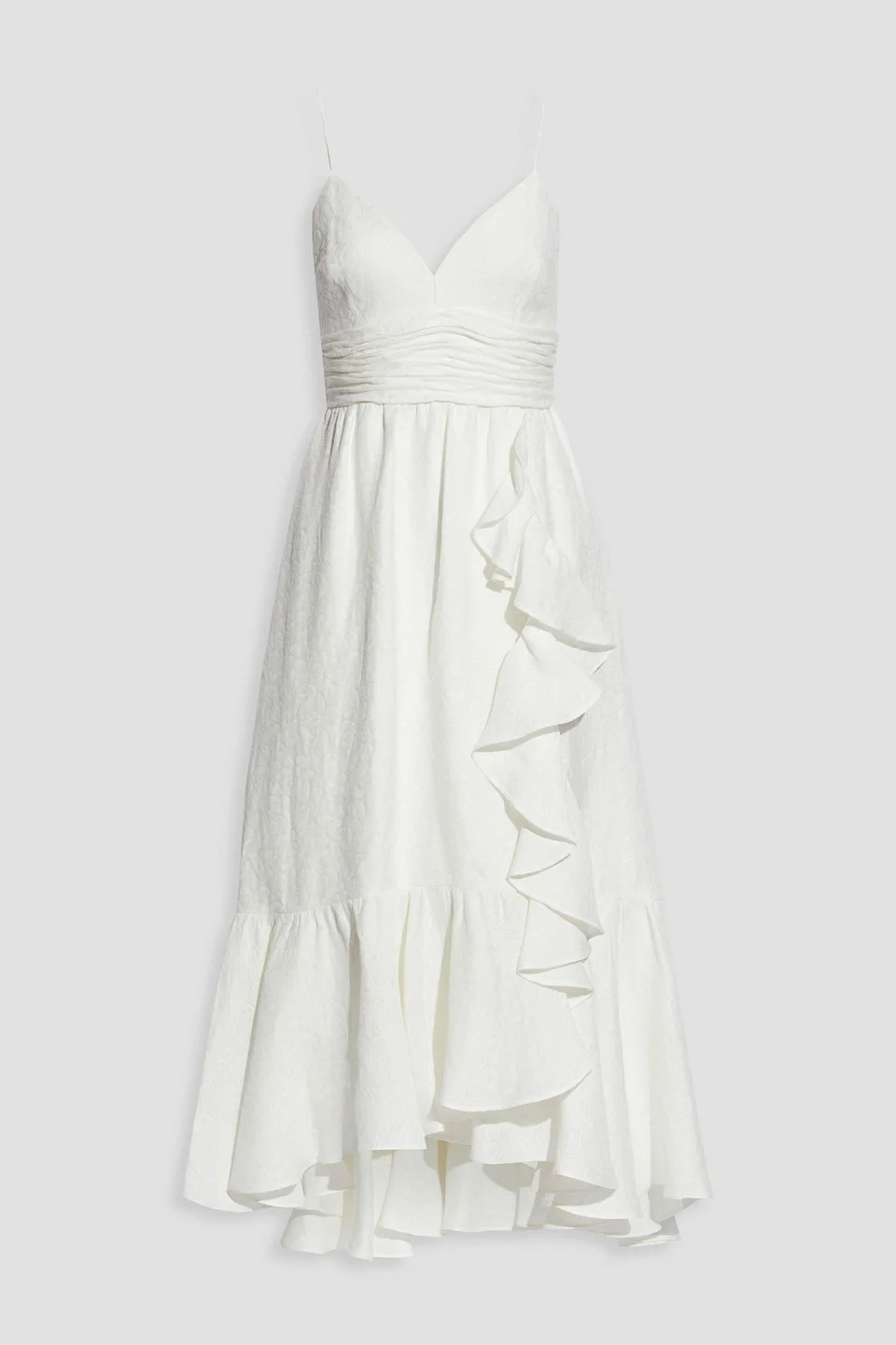 Dress jacquard tiered wrap-effect ruffled concealed hook and zip fastening at back partially lined non-stretchy fabric mid-weight fabric dry clean imported 43% Linen 39% Viscose 18% Silk Product Code 42247633208196032