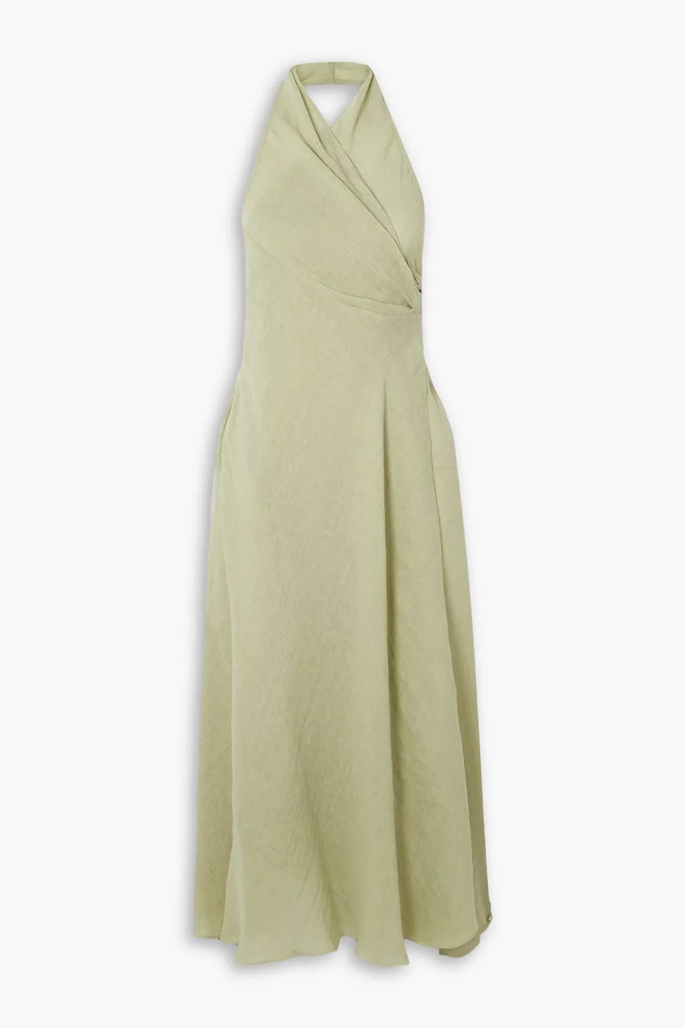 Wrap dress linen-blend two side slit pockets ties at waist lightweight, non-stretchy fabric hand wash or dry clean imported Catherine Johnson, creator of Three Graces London, aims is to make everyday feel like "a warm weather escape, " and you can rely on this 'Yara' dress to do that. Cut from lightweight 'Powder Green' linen-blend, it a halterneck and wraparound waist tie that effortlessly drapes across your figure. Add strappy sandals on balmy days. 94% Linen 6% Polyamide Product Code 1647597352013574