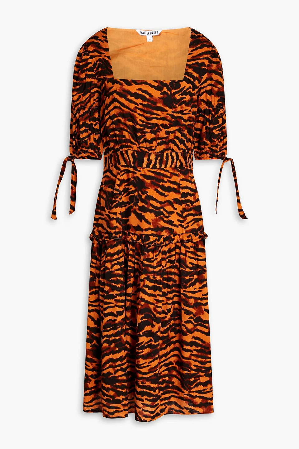 Dress tiger-print jacquard ruffled trims gathered elasticated cuffs fully lined concealed zip fastening along side non-stretchy fabric mid-weight fabric machine wash imported 100% Viscose Product Code 1647597297284506