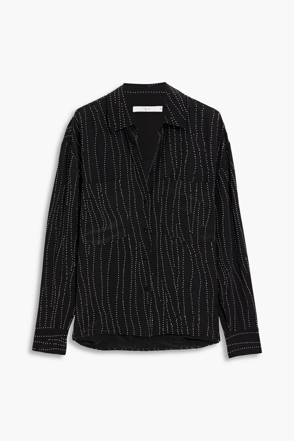 Shirt crepe de chine studded pleated back buttoned cuffs breast pockets side slits dipped back hem button fastenings through front hand wash imported 65% Viscose 35% Silk Product Code 1647597357112281
