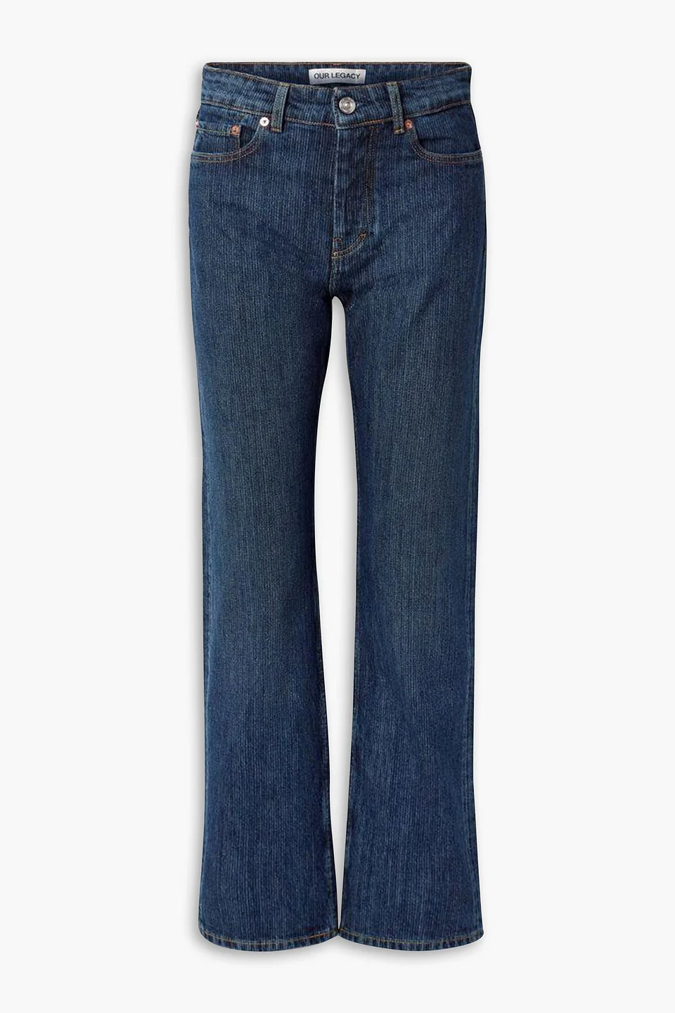 Straight-leg jeans denim belt loops high-rise cut five pockets partially concealed button fastenings along front mid-weight, non-stretchy fabric machine wash imported Our Legacy's jeans are made from the label's Italian chain-twill denim that appears as though it's been intricately woven. They're designed to sit high on the waist and have a classic five-pocket construction and straight legs. 100% Cotton Product Code 1647597354499974