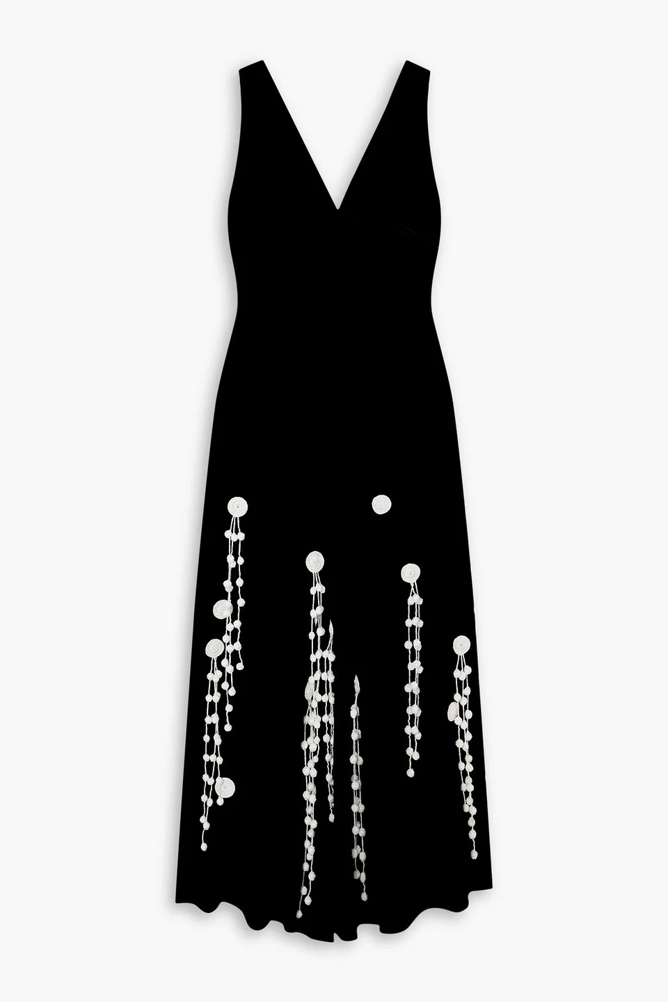 Dress velvet embroidered appliqued poplin trims concealed hook and zip fastening at back fully lined mid-weight, non-stretchy fabric dry clean made in italy Proenza Schouler's dress is cut from plush black velvet and gently gathered at the waist with origami-like folds. The floaty, A-line skirt is appliqued with white crocheted pompoms for a striking effect. Style yours with long, layered necklaces. 65% Rayon 35% Cupro Product Code 1647597346885236