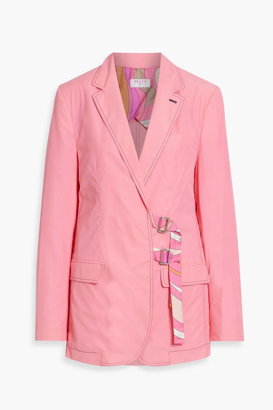 Blazer taffeta printed trims buttoned cuffs breast pocket front flap pockets buckle fastening at front partially lined back vent mid-weight, non-stretchy fabric dry clean made in italy 53% Polyamide 47% Cotton Product Code 46376663162925564