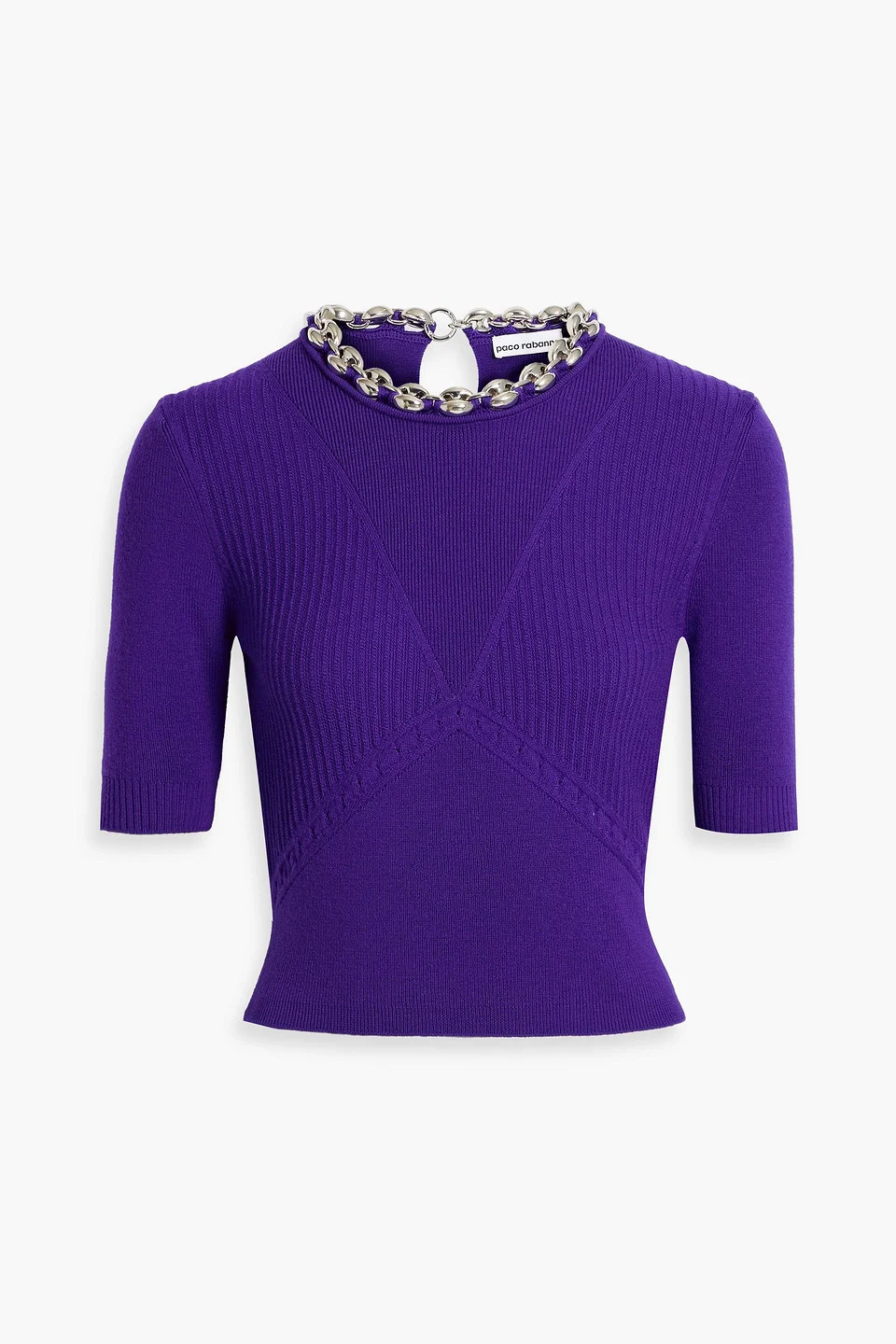 Top wool-blend ribbed chain-embellished hook-fastening keyhole at back mid-weight knit hand wash imported 90% Wool 10% Elastane Product Code 1647597349801796