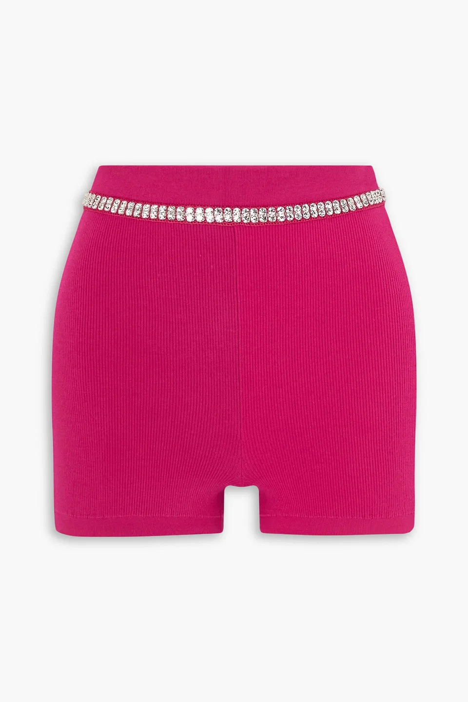 Shorts ribbed jersey crystals high-rise cut pull on dry clean imported Paco Rabanne's shorts are made from vibrant-pink ribbed-jersey that molds to your figure. They're designed with an elasticated high-rise waist accentuated by rows of sparkling crystals. 66% Viscose 20% Elastane 14% Polyester Product Code 1647597287844221