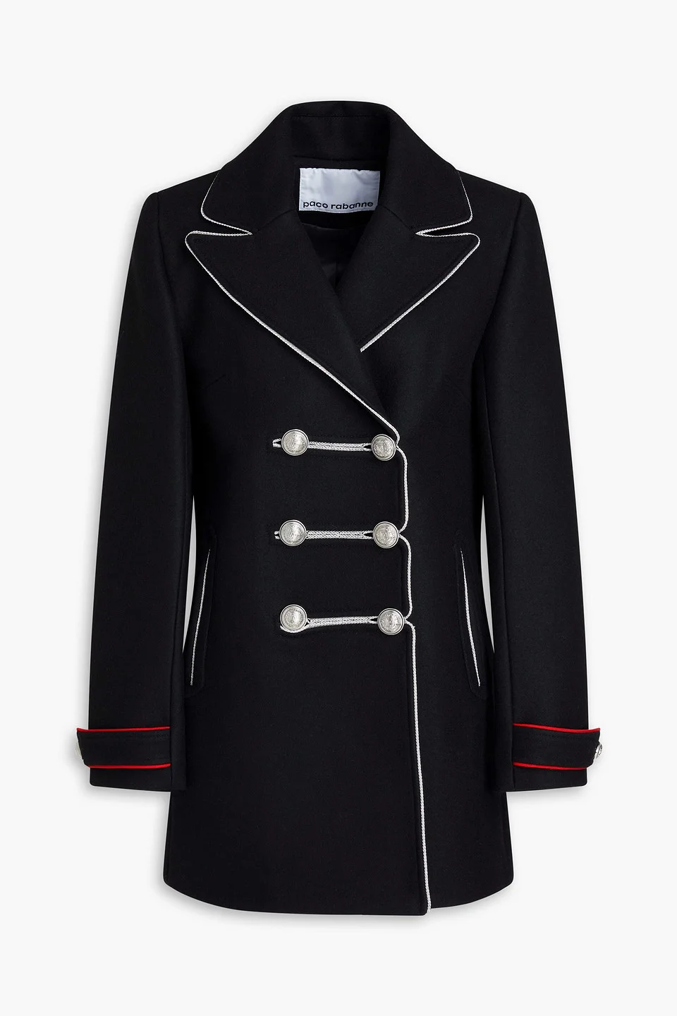 Coat felt wool-blend metallic trim shoulder pads half-belt two front slit pockets back vent fully lined button fastenings through double-breasted front mid-weight, non-stretchy fabric dry clean imported 70% Wool 20% Polyamide 10% Cashmere Product Code 1647597356469964