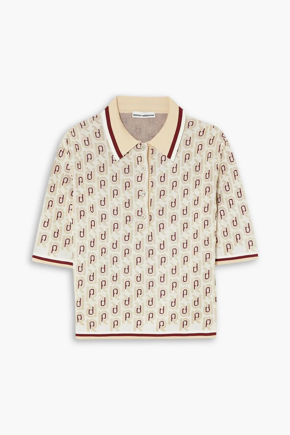 Polo shirt logo-print metallic jacquard-knit striped trims button fastenings along front mid-weight knit dry clean imported Rabanne's polo shirt is one of our favorites, they come in all shapes and styles. It's jacquard-knitted with the brand's monogram and has sporty striped trims. Wear yours with vintage-wash denim and flats. 100% Viscose Product Code 1647597326691650
