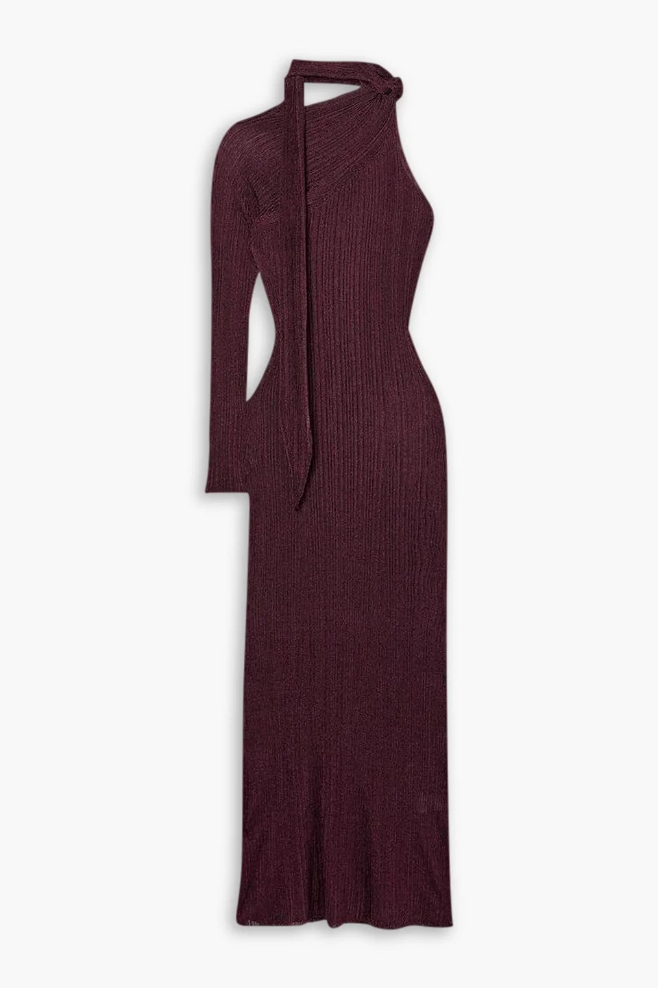 One-sleeve tie-detailed metallic plissé-knit maxi dress