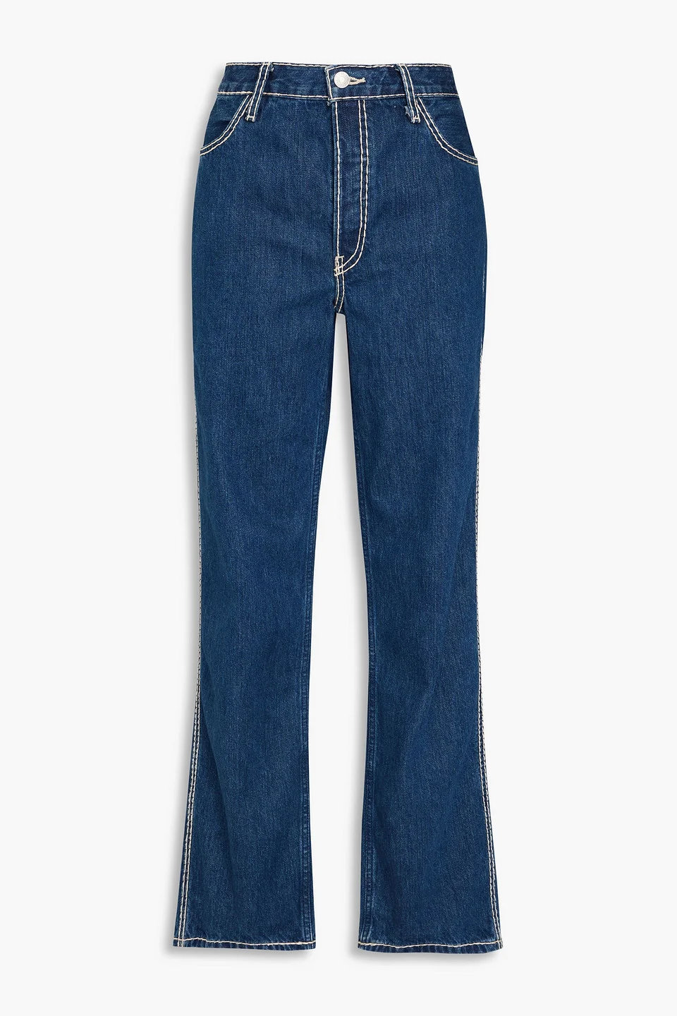 Straight-leg jeans denim belt loops high-rise cut five pockets partially concealed button fastenings along front mid-weight, non-stretchy fabric machine wash or dry clean imported 100% Cotton Product Code 1647597345605927