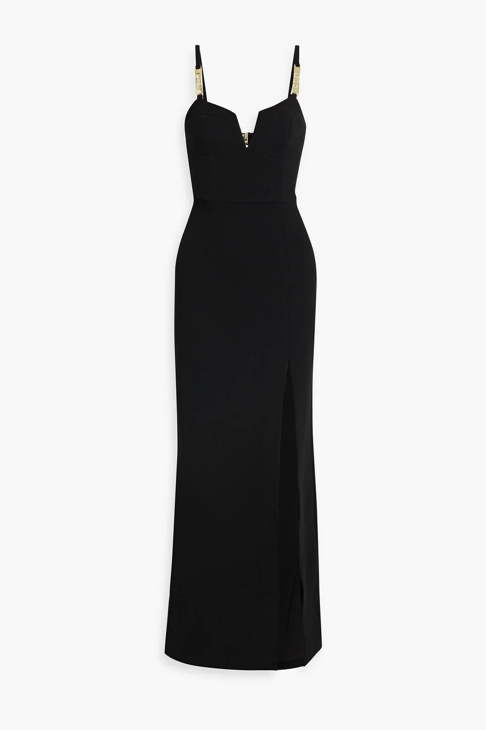 Style yours with drop earrings and towering heels for an evening spent celebrating gown crepe chain trims cutout front split clasp fastening at back concealed hook and zip fastening at back internal boning fully lined mid-weight, slightly stretchy fabric dry clean imported 98% Polyester 2% Spandex Product Code 1647597336176768