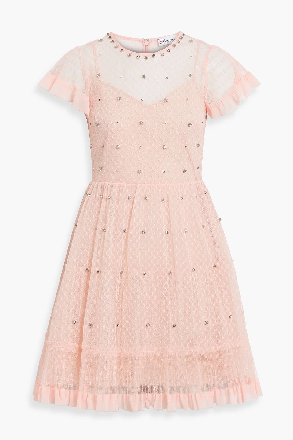 Dress point d'esprit crystals ruffled trims pleated concealed zip fastening along back detachable slip to line lightweight, non-stretchy sheer fabric hand wash or dry clean imported 100% Polyester Product Code 1647597358193096