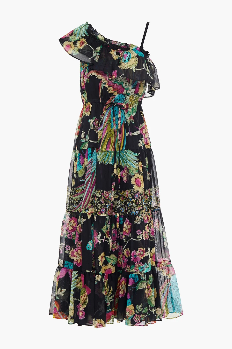 Dress printed voile cotton and silk-blend ruffled trims gathered tiered elasticated neckline drawstring waist slips on fully lined non-stretchy fabric lightweight fabric dry clean imported 73% Cotton 27% Silk Product Code 17411127376984054