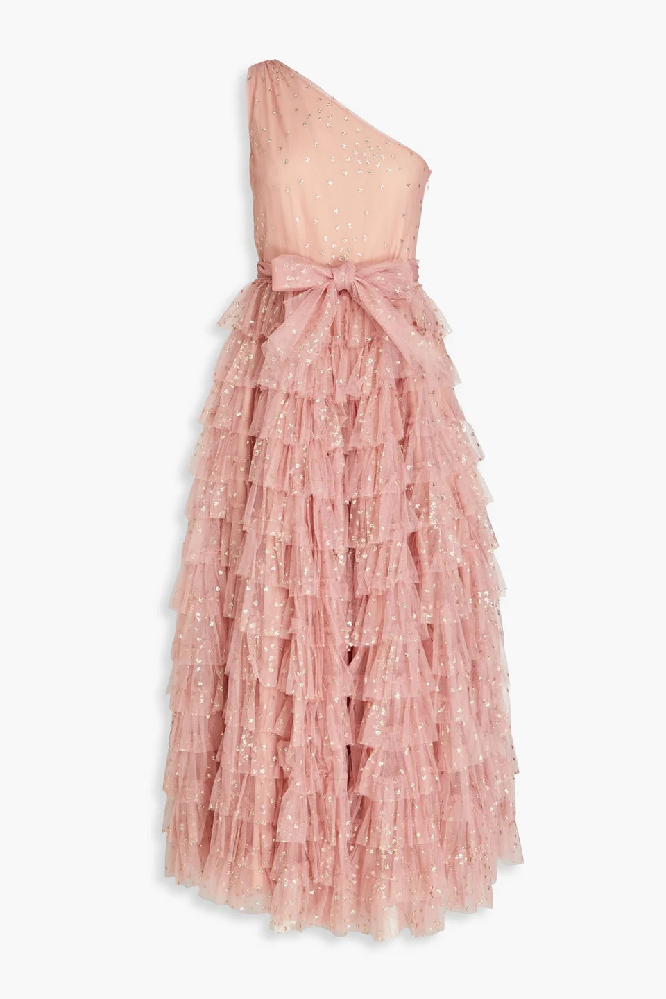 One-shoulder dress tulle glittered bow-detailed tiered concealed hook and zip fastening at side fully lined lightweight, non-stretchy sheer fabric dry clean imported 100% Polyamide Product Code 1647597330940603