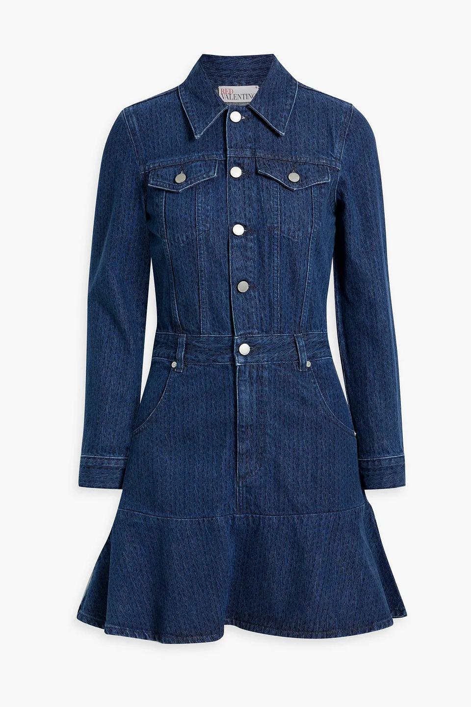Shirt dress printed denim buttoned waist tabs buttoned cuffs multipockets ruffled hem button and concealed zip fastenings at front non-stretchy fabric mid-weight fabric dry clean imported 100% Cotton Product Code 1647597331562337
