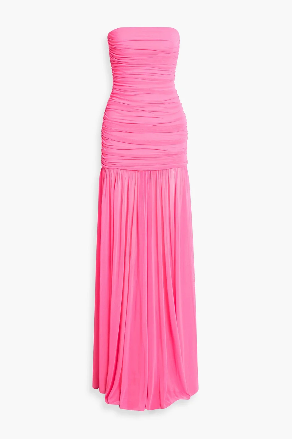 Strapless dress stretch-mesh ruched side slit concealed hook and zip fastening at side fully lined lightweight, stretchy fabric dry clean imported 100% Polyester Product Code 46376663163082948