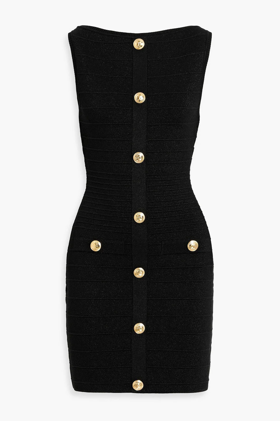Dress metallic ribbed-knit button-embellished faux pockets slips on mid-weight knit dry clean imported 60% Rayon 32% Nylon 5% Metallic fiber 3% Spandex Product Code 46376663163008184