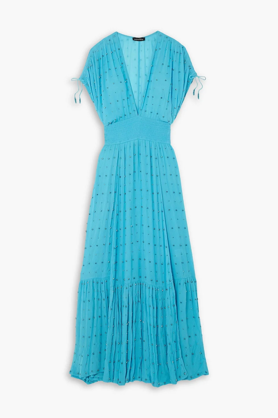 Catch eyes all night in this intricately embellished floor-sweeping design gown silk-georgette crystals tiered drawstring ties shirred front split slips on non-stretchy fabric mid-weight fabric dry clean imported 100% Silk Product Code 1647597327745024