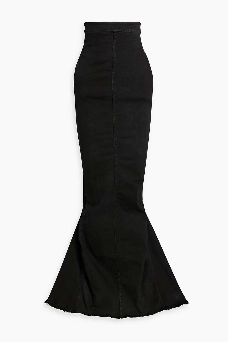 Skirt denim frayed trims fluted hem zip fastening along back mid-weight, non-stretchy fabric hand wash or dry clean made in italy 91% Cotton 6% Elastomultiester 3% Textile fibers Product Code 46376663162846860