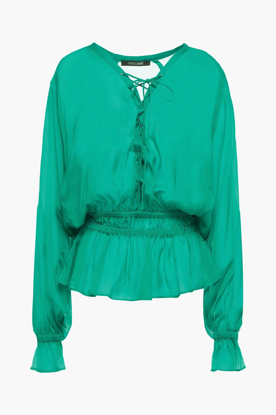 Blouse silk-chiffon embellished gathered elasticated waist elasticated cuffs ties at front transparent fabric lightweight fabric dry clean made in italy 100% Silk Product Code 25185454457400400