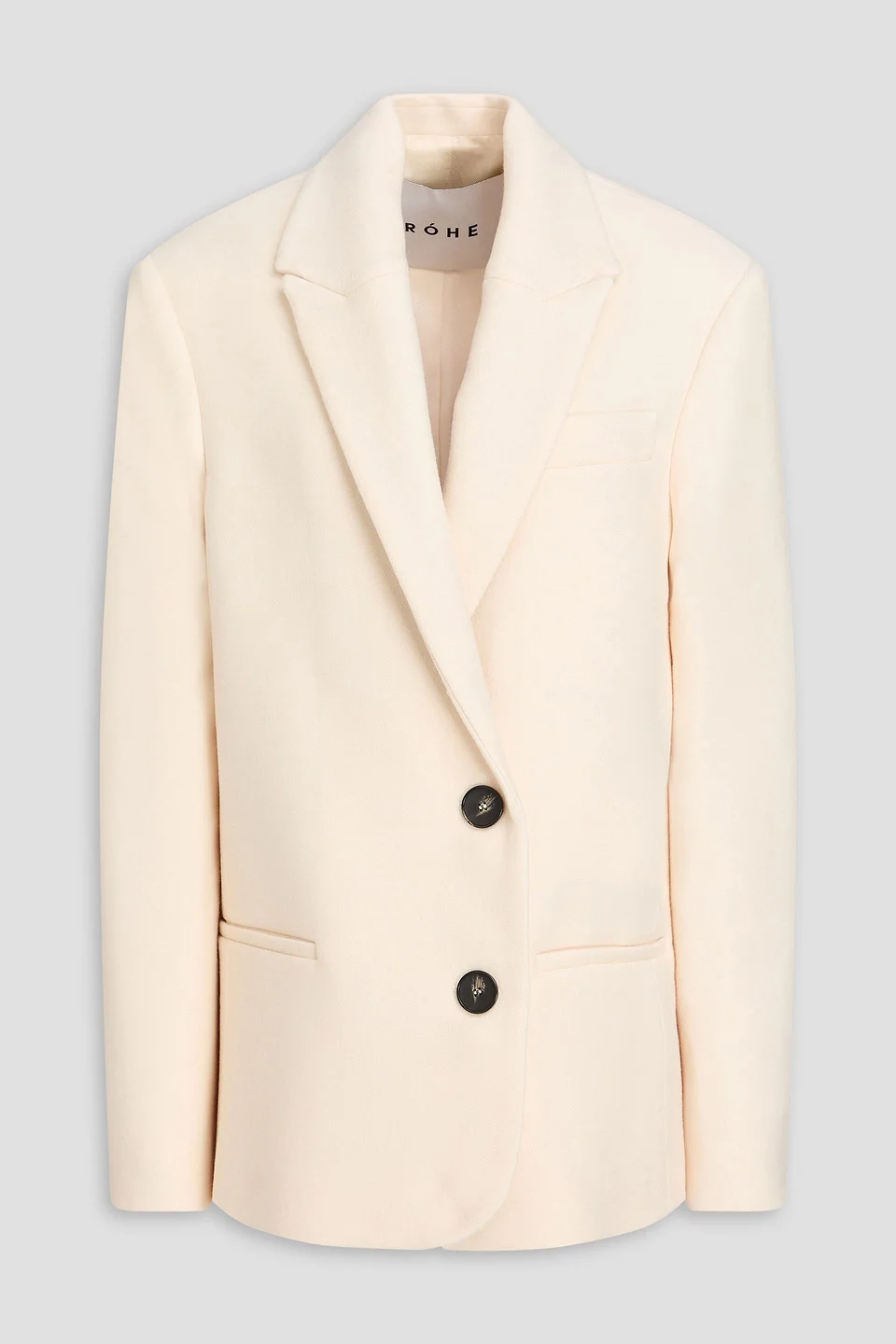 Blazer wool shoulder pads slit cuffs breast pocket two front welt pockets button fastenings through front fully lined mid-weight, non-stretchy fabric dry clean imported 100% Virgin Wool Product Code 1647597352340061