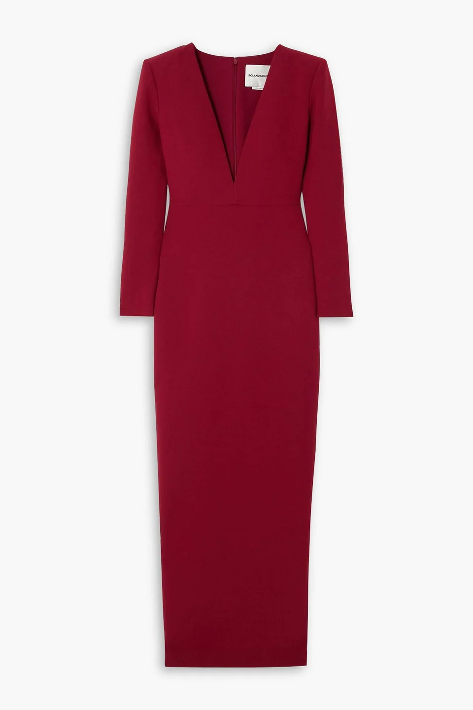 Style yours with strappy sandals for your next dinner party or benefit gown crepe shoulder pads zipped cuffs back slit concealed hook and zip fastening at back mid-weight, non-stretchy fabric hand wash imported 84% Polyester 10% Viscose 6% Elastane Product Code 46376663163075785