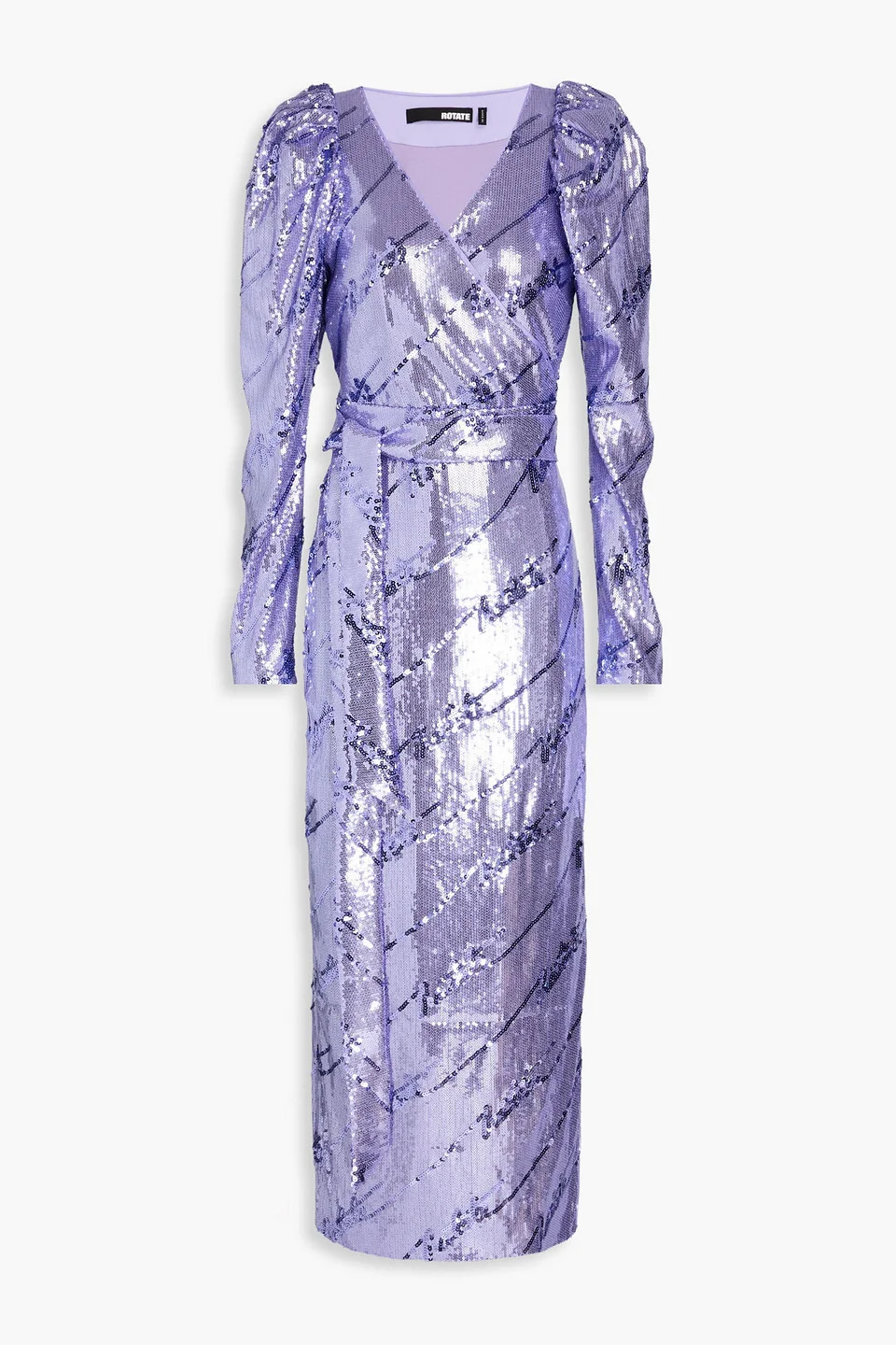 Wrap dress mesh sequins gathered sleeves ties at waist concealed hook fastening at front fully lined lightweight, heavily embellished fabric dry clean imported 95% Polyester 5% Elastane Product Code 1647597347095112