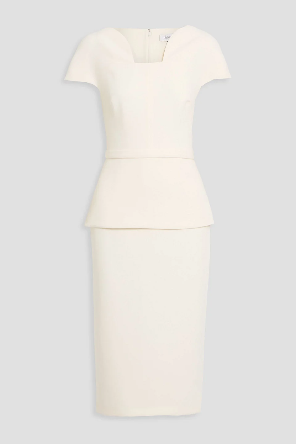Dress crepe peplum detachable belt back slit concealed hook and zip fastening at back fully lined mid-weight, slightly stretchy fabric dry clean Oh-so-chic, Safiyaa's 'Geenie' midi dress might be perfect for your special day. Made from smooth ivory crepe, it has a flattering peplum waist and cap sleeves. Perfect for courthouse ceremonies or good-bye brunches, add a pop of color with a bright clutch. 92% Polyester 8% Elastane Product Code 46376663163113158
