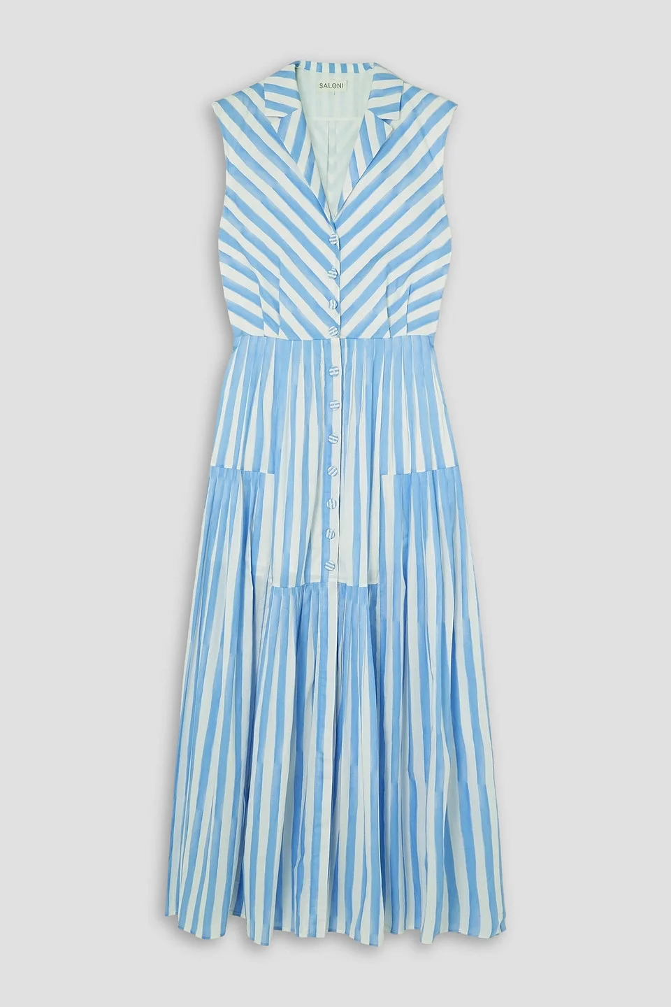 Dress striped cotton-poplin pleated tiered two side slit pockets button fastenings through front partially lined dry clean imported Saloni's designs are inspired by its founder's love of color and textiles. This 'Arya' dress is cut from certified cotton-poplin and patterned with sky-blue stripes. Stepped pleats through the midi skirt add fullness and visual interest. 100% Cotton Product Code 1647597348057059