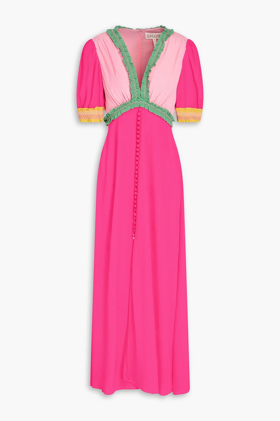 Dress color-block crepe button-embellished ruffled trims smocked trims front split concealed hook and zip fastening at back fully lined mid-weight, non-stretchy fabric dry clean imported 58% Rayon 42% Viscose Product Code 46376663162902475
