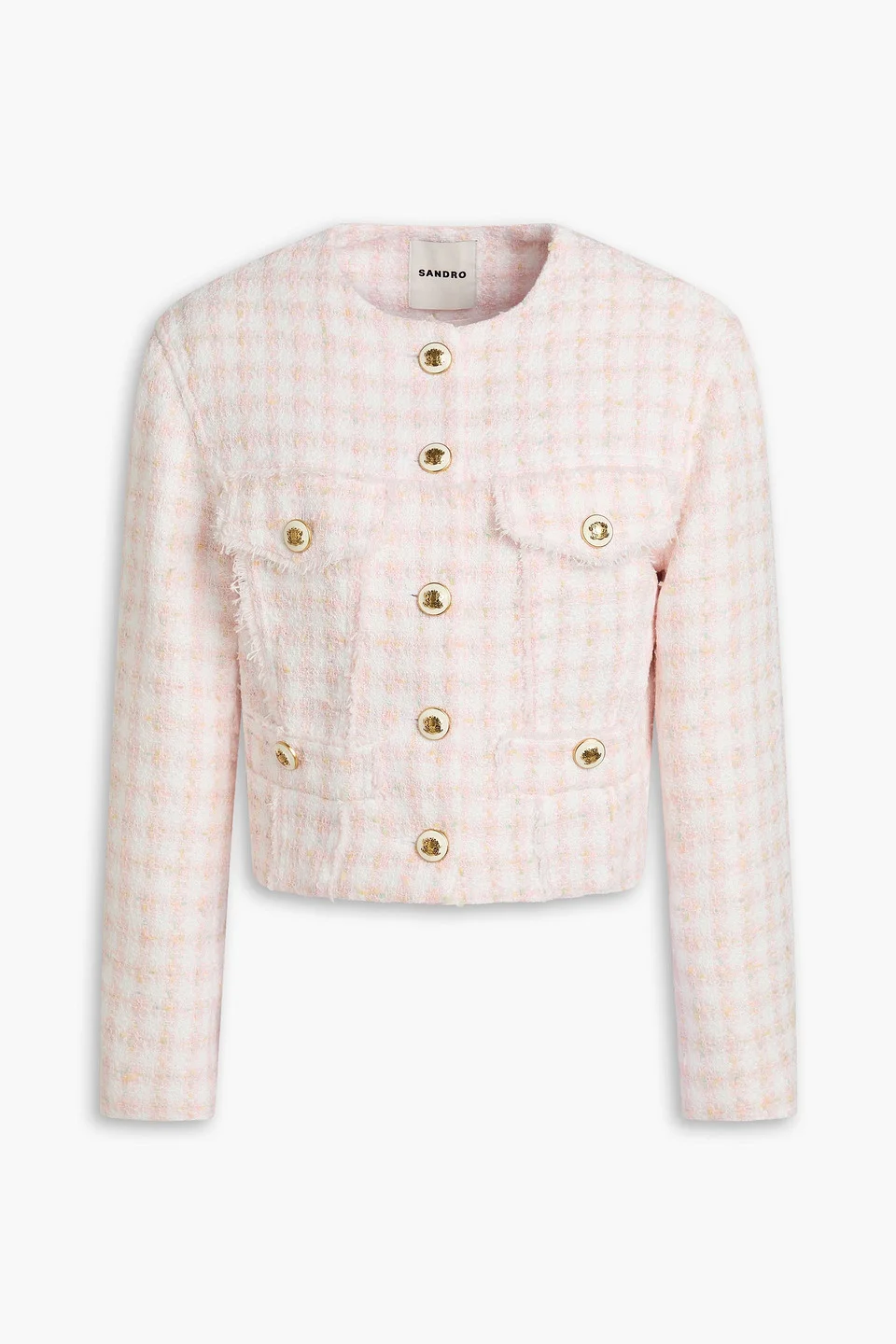 Jacket metallic checked tweed frayed trims faux pockets button fastenings through front fully lined mid-weight, non-stretchy fabric dry clean imported 100% Polyester Product Code 46376663162843707