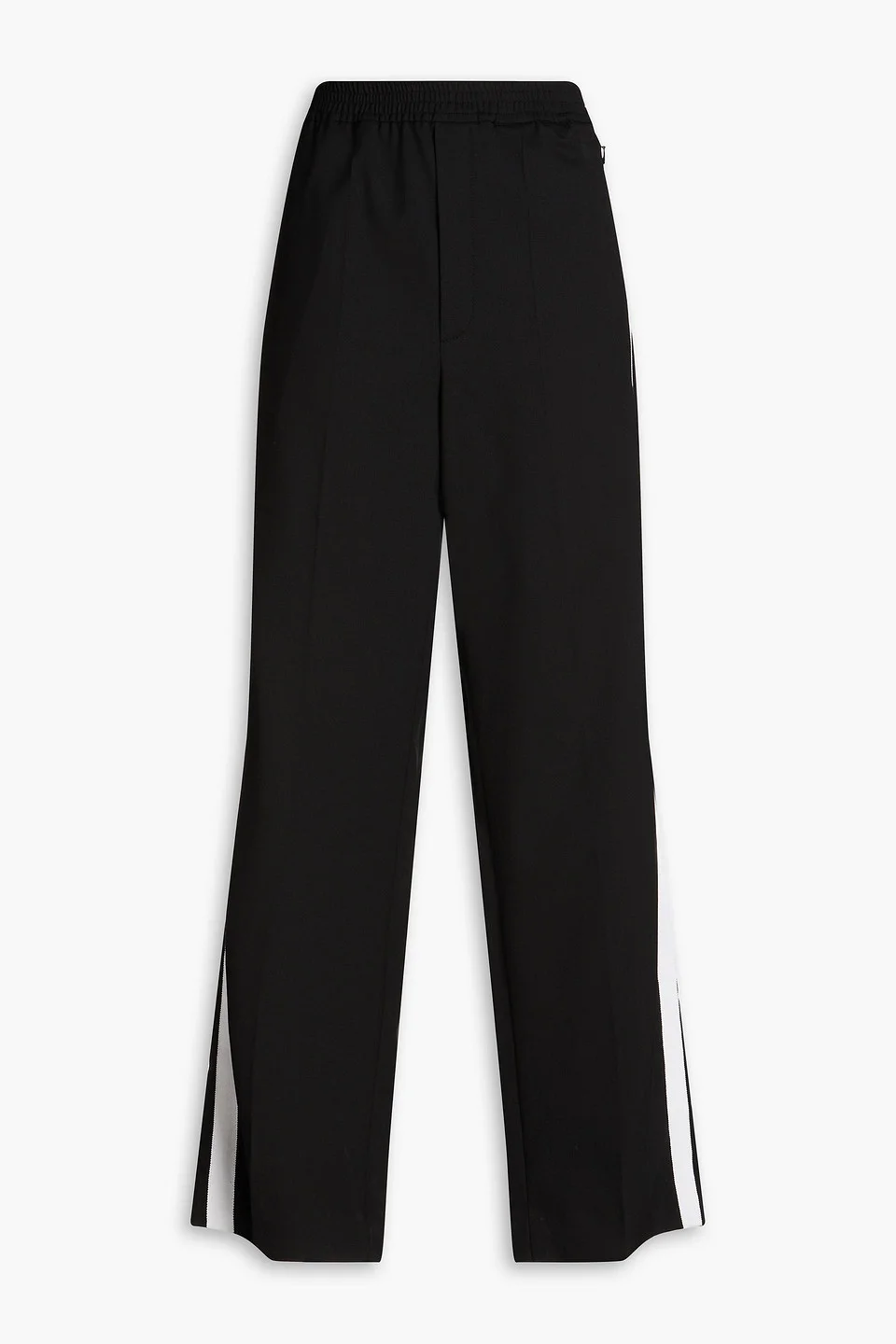 Wide-leg pants twill grosgrain trims side seam stripes zip pockets two back flap pockets elasticated waist high-rise cut pull on mid-weight, stretchy fabric dry clean imported 54% Polyester 44% Wool 2% Elastane Product Code 1647597349172176