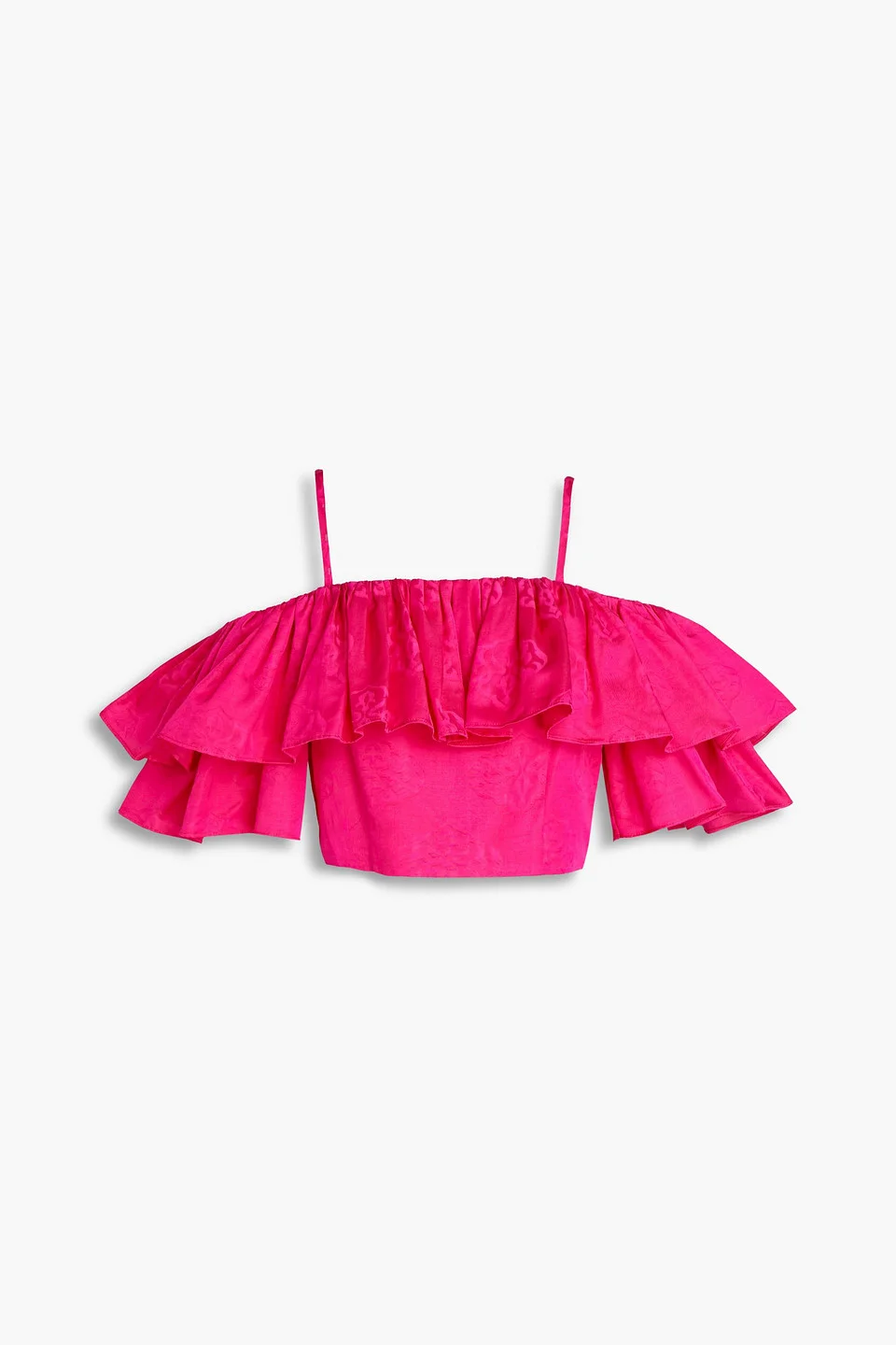 Cold-shoulder top floral-jacquard cropped adjustable straps ruffled zip fastening through back fully lined non-stretchy fabric mid-weight fabric dry clean imported 84% Viscose 13% Cotton 3% Linen Product Code 1647597279024372