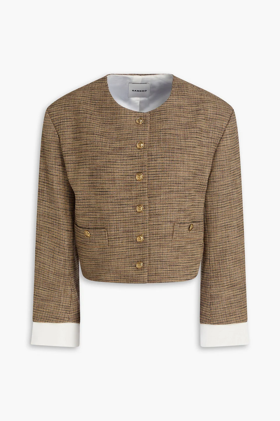 Jacket houndstooth tweed shoulder pads detachable cuffs front welt pockets button fastenings through front fully lined mid-weight, non-stretchy fabric dry clean imported 62% Viscose 35% Polyester 3% Elastane Product Code 46376663162956780