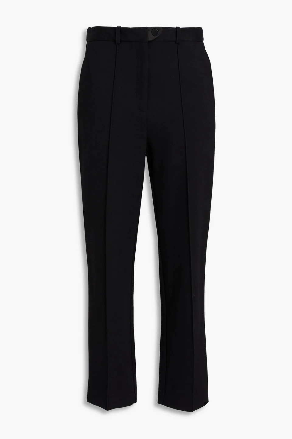 Straight-leg pants jersey satin trims stitched front creases side slant pockets belt loops high-rise cut button and concealed hook and zip fastening at front mid-weight, slightly stretchy fabric dry clean imported 62% Viscose 33% Polyamide 5% Elastane Product Code 46376663162957030