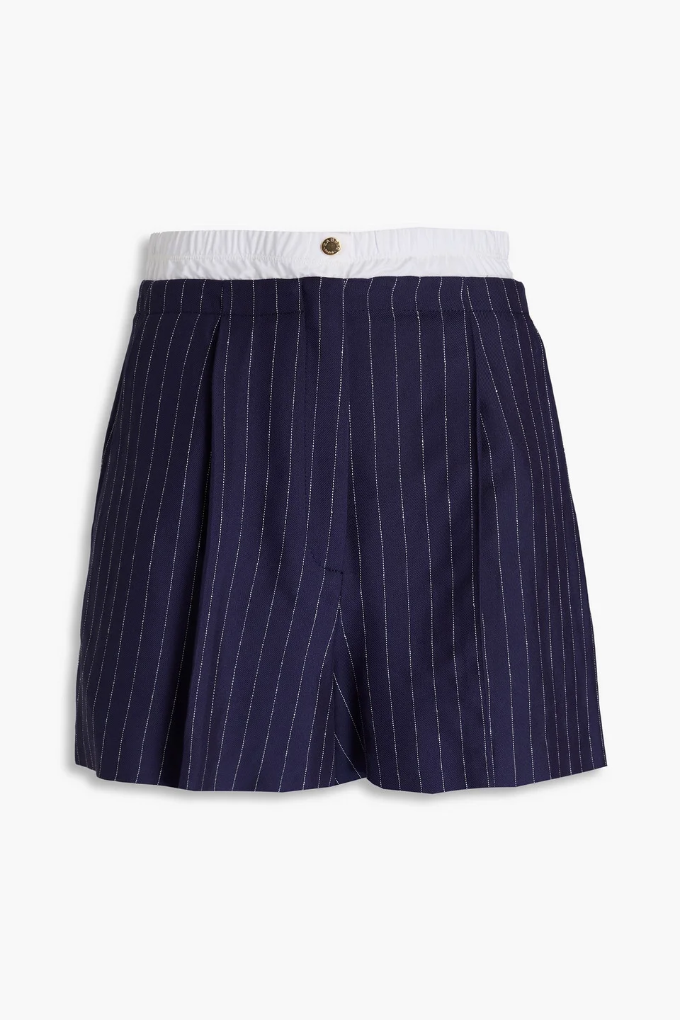 Shorts pinstriped twill pleated poplin trims elasticated waist high-rise cut side slit pockets back welt pockets snap and concealed zip fastening at front mid-weight, non-stretchy fabric dry clean imported 99% Viscose 1% Polyamide Product Code 46376663162843681