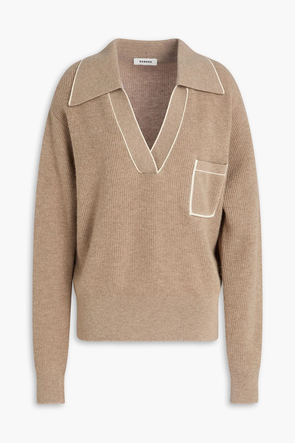Polo sweater wool and cashmere-blend ribbed crochet trims breast pocket slips on mid-weight knit hand wash or dry clean imported 72% Wool 28% Cashmere Product Code 46376663162957029