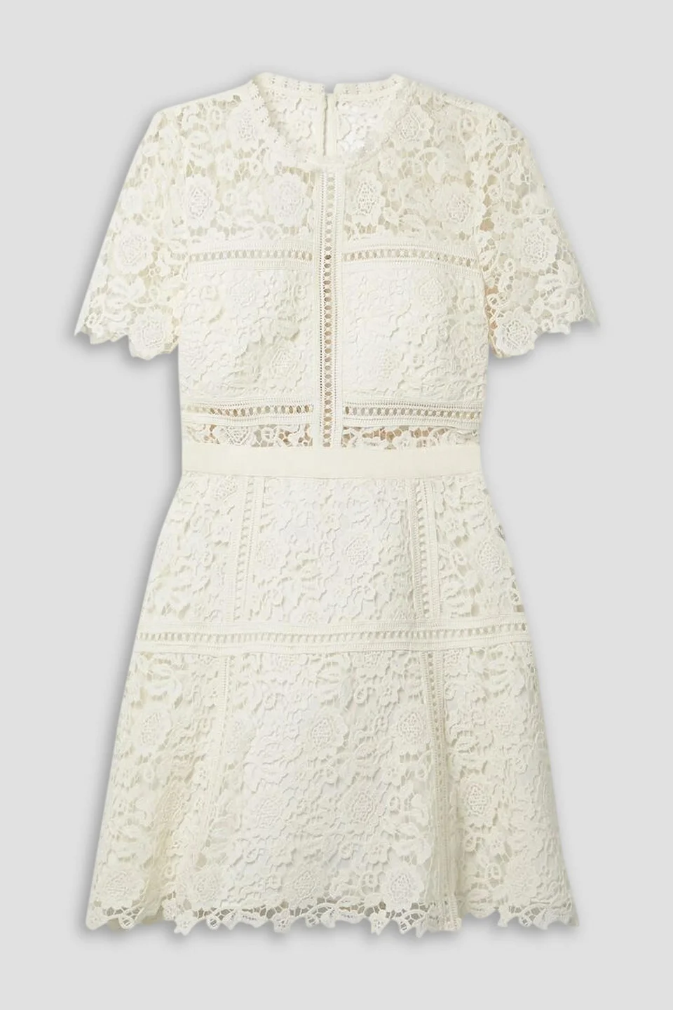 Dress corded lace grosgrain trims button-fastening keyhole at back zip fastening along back fully lined mid-weight, non-stretchy fabric dry clean imported A special bridal piece from Self-Portrait, this mini dress is made from ivory floral corded lace, so it's perfect for those who are searching for something that's not a bright white. It's partially lined for coverage where you'll need it most and has grosgrain trimming at the waist and artfully scalloped trims. The best part? You'll get so much wear out of it long after your big day, too. 98% Polyester 2% Polyamide Product Code 1647597358829094