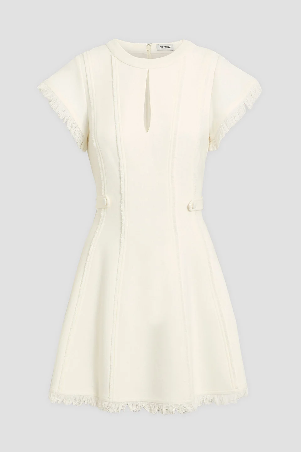 Dress tweed fringed trims cutout buttoned waist tabs concealed hook and zip fastening at back fully lined mid-weight, slightly stretchy fabric machine wash imported Simkhai’s 'Anielle' mini dress is prim and proper with a little edge. Made from snow-white tweed, the fringed trims and keyhole cutout make it perfect for your next brunch or day date. An added bonus? The buttoned tabs cinch your waist just right. 62% Polyester 33% Rayon 5% Spandex Product Code 46376663163008743
